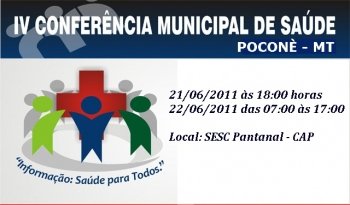 Entre os dias 21 e 22 de junho será realizado em Poconé a IV Conferência Municipal de Saúde, no auditório do SESC Pantanal/CAP. Promovida pela Secretaria Municipal de Saúde em parceria com o Conselho Municipal de Saúde, a Conferência Municipal terá inicio no dia 21, terça – feira, a partir das 18horas.